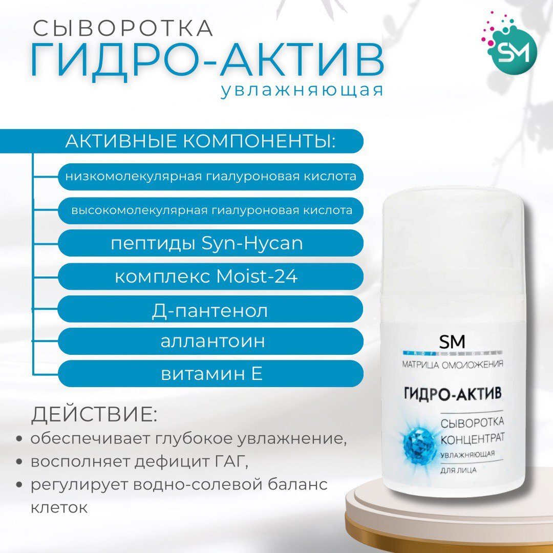 Активные компоненты: низкомолекулярная и высокомолекулярная гиалуроноваякислоа, комплекс пептидов Syn-Hycan, комплекс Moist-24, Д-пантенол, аллантоин, витамин Е.